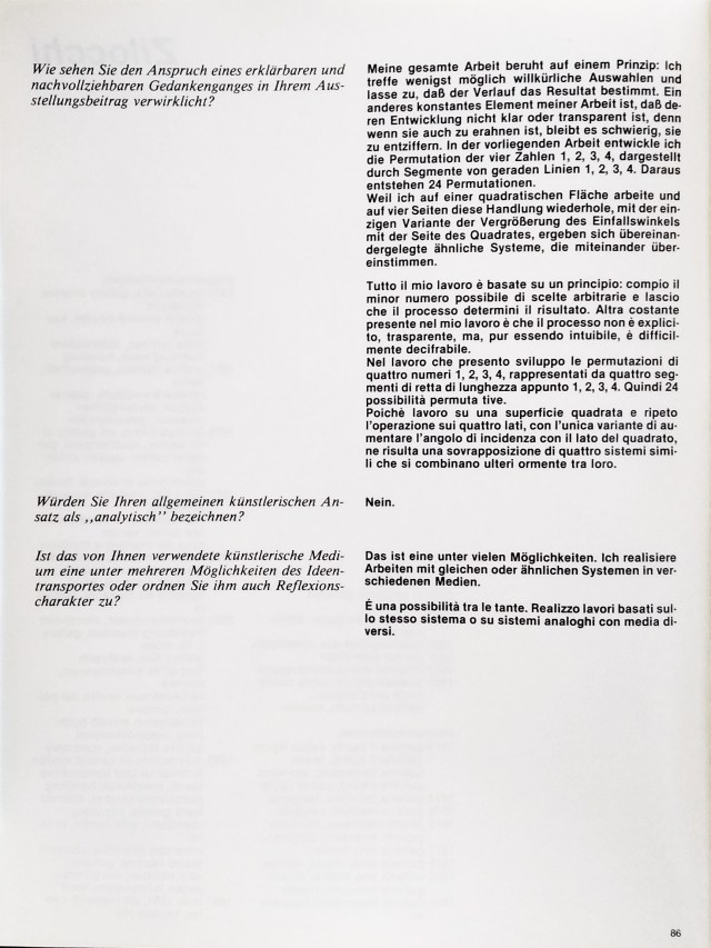 Ein Künstler – ein Prinzip, I progetti per questo portfolio sono stati sviluppati in occasione del “International Symposium Schloss Buchberg” nell’agosto 1979 – testi del catalogo di Dieter Bogner.