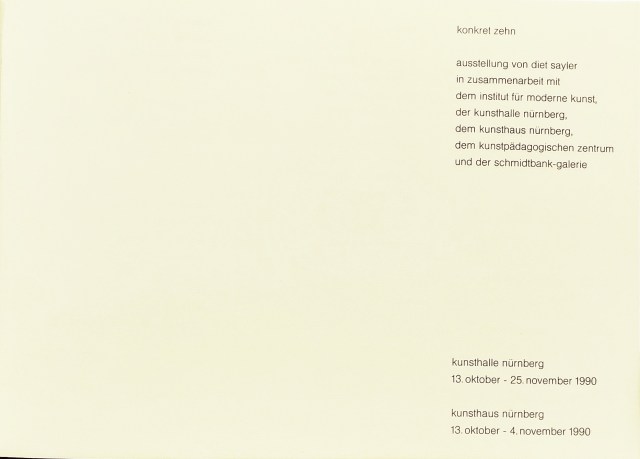 (Konkret Zehn – ausstellung von diet sayler in zusammenarbeit mit dem institut für moderne kunst, der kunsthalle nürnberg, dem kunsthaus nürnberg, dem kunstpädagogischen zentrum und der schmidtbank-galerie – kunsthalle nürnberg, 13 ottobre/25 novembre 1990 – kunsthaus nürnberg, 13 ottobre/4 novembre 1990)